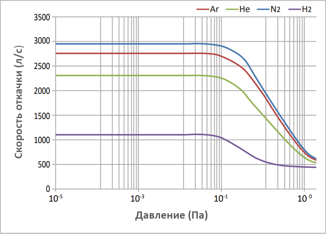 Скорость откачки по азоту (N2) 3000 л/с, по аргону (Ar) – 2750 л/с, по гелию (He) – 2300