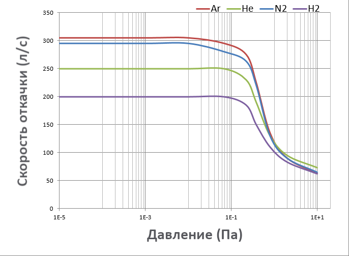 Номинальная скорость откачки по азоту составляет 300 л/с, степень сжатия по азоту — 1×109, а по гелию — 1×106, поэтому насос эффективно работает даже с легкими газами. Насос может работать при повышенном форвакуумном давлении на выхлопном фланце до 500 Па, а в пиковых режимах давление может кратковременно достигать 700 Па и 1500 Па в момент запуска. Это повышает его устойчивость к изменениям режима откачки и упрощает требования к форвакуумной системе, для которой рекомендуется производительность от 3,6 до 10,8 м3/ч.
