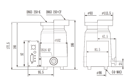 Базовая комплектация предусматривает выбор входного фланца: CF63 для систем сверхвысокого вакуума или ISO-K63 (KF) для высоковакуумных применений. Выходной (форвакуумный) фланец стандартизирован как DN16 ISO-KF. Рекомендуемая производительность форвакуумного насоса составляет от 1.8 до 7.2 м3/ч.