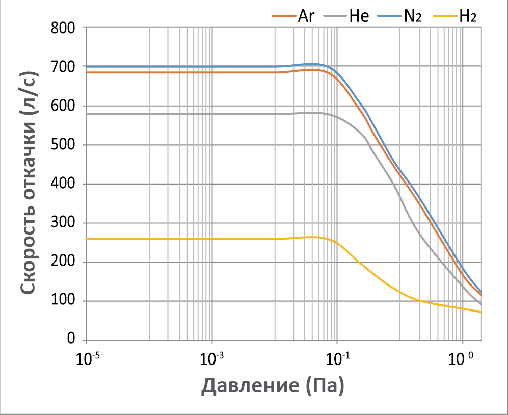 Высокий коэффициент сжатия для азота (1×109) и аргона (1×109), водорода (1×106) и гелия (1×107) гарантирует эффективное удаление легких газов из системы. Со скоростью откачки 700 л/с по азоту насос подходит для большинства применений, где требуется высокий вакуум. При этом скорость откачки 260 л/с по водороду является хорошим показателем, позволяющим поддерживать низкое парциальное давление водорода в системе.