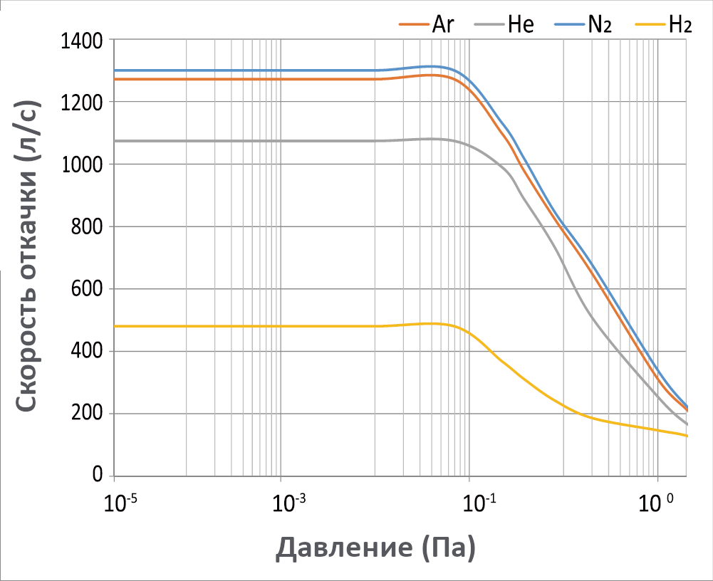 Высокий коэффициент сжатия для азота и аргона (109), водорода (103) и гелия (104) гарантирует эффективное удаление легких газов из системы. Скорость откачки 1300 л/с по азоту делает насос подходящим для большинства применений в высоковакуумных приложениях. При этом скорость откачки 480 л/с по водороду является достаточной для поддержания низкого парциального давления водорода в системе. Для стабильной работы насоса рекомендуется форвакуумный насос с производительностью до 60-65 м3/ч.
