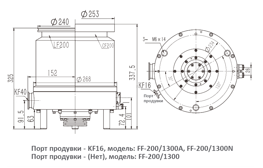 KYKY FF-200/1300 (модель с воздушным охлаждением) с механическим подвесом ротора на керамических подшипниках с консистентной смазкой. Эта схема обеспечивает высокую надежность и позволяет проводить монтаж насоса в любом пространственном положении. Конструкция насоса с молекулярной ступенью обеспечивает стабильную работу при давлении на выхлопном фланце до 240 Па непрерывно и до 600 Па кратковременно.