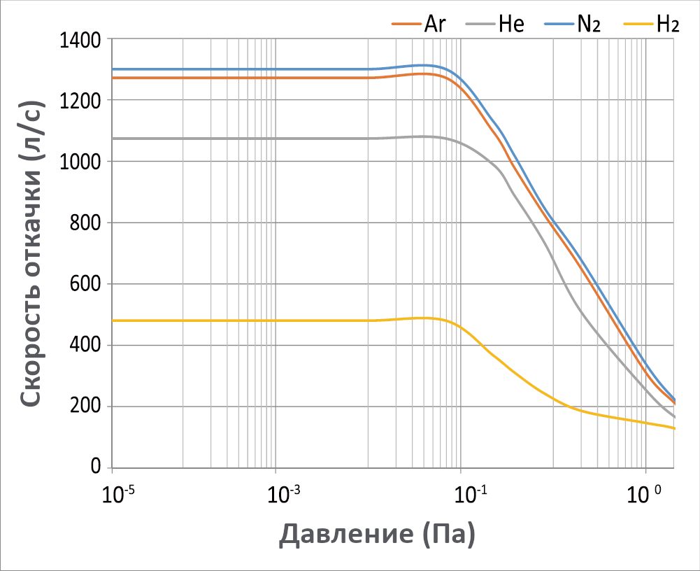 Коэффициенты сжатия для азота и аргона (109), для водорода (103) и гелия (104) гарантирует эффективное удаление легких газов из системы. Скорость откачки 1300 л/с по азоту делает насос подходящим для большинства применений в высоковакуумных приложениях. При этом скорость откачки 480 л/с по водороду является достаточной для поддержания низкого парциального давления водорода в системе. Для стабильной работы насоса рекомендуется форвакуумный насос с производительностью до 60-65 м3/ч.