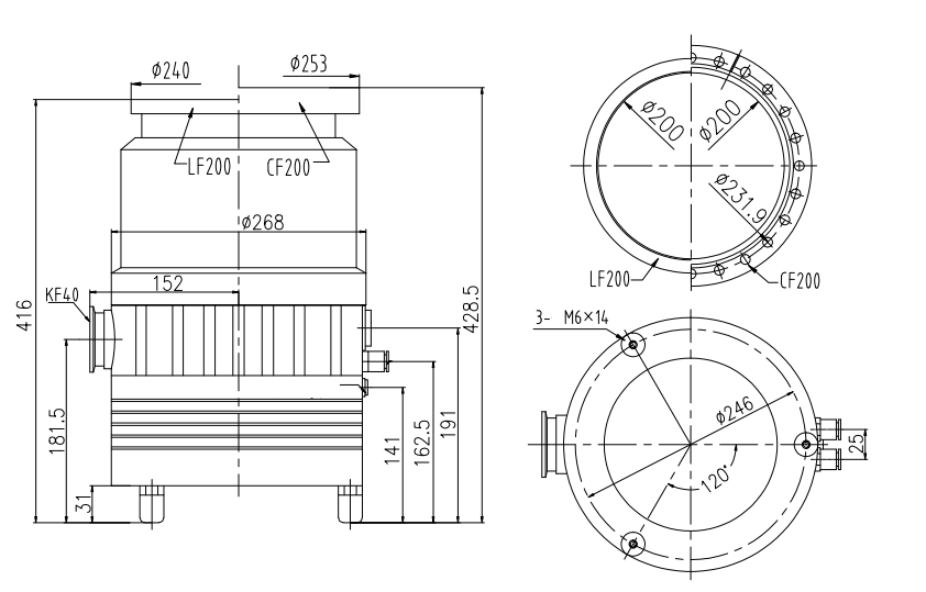 KYKY FF-200/1300F (модель с водяным охлаждением) с механическим подвесом ротора на керамических подшипниках с консистентной смазкой. Эта схема обеспечивает высокую надежность и позволяет проводить монтаж насоса в любом пространственном положении. Конструкция включает молекулярную ступень, что обеспечивает стабильную работу при давлении на выхлопном фланце до 240 Па непрерывно и до 600 Па кратковременно.