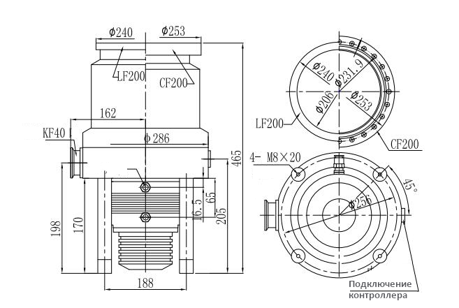Ротор насоса вращается с номинальной скоростью 24 000 об/мин и выходит на рабочий режим за время не более 9 минут. Стандартное исполнение насоса предусматривает водяное охлаждение с расходом теплоносителя не менее 1 л/мин при температуре на входе не выше 25oC. Конструкция насоса допускает его установку в вертикальном положении с допустимым отклонением ±5o. Комплектуется входными фланцами DN200 CF или DN200 ISO-K, а также выходным фланцем KF40.