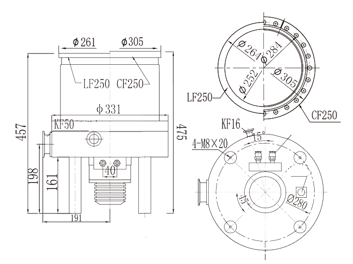 Турбомолекулярный насос KYKY FF-250/1500 обеспечивает скорость откачки по азоту 1500 л/с и предельный вакуум 6×10-7 Па в конфигурации с фланцем CF. Конструкция насоса основана на классической схеме с механическими подшипниками и масляной системой смазки, обеспечивающей длительный срок службы и стабильность работы в непрерывном режиме. Насос демонстрирует высокие коэффициенты компрессии: 108 для азота и аргона, 104 для гелия и 103 для водорода, что позволяет эффективно работать с широким спектром технологических газов. Ротор насоса вращается с номинальной скоростью 21 000 об/мин при времени выхода на рабочий режим не более 8 минут. Стандартное исполнение предусматривает водяное охлаждение с расходом теплоносителя не менее 1 л/мин и температурой на входе до 25oC. Конструкция насоса комплектуется входными фланцами DN250 CF или DN250 ISO-K и выходным фланцем KF40, что обеспечивает универсальность интеграции в различные вакуумные системы.